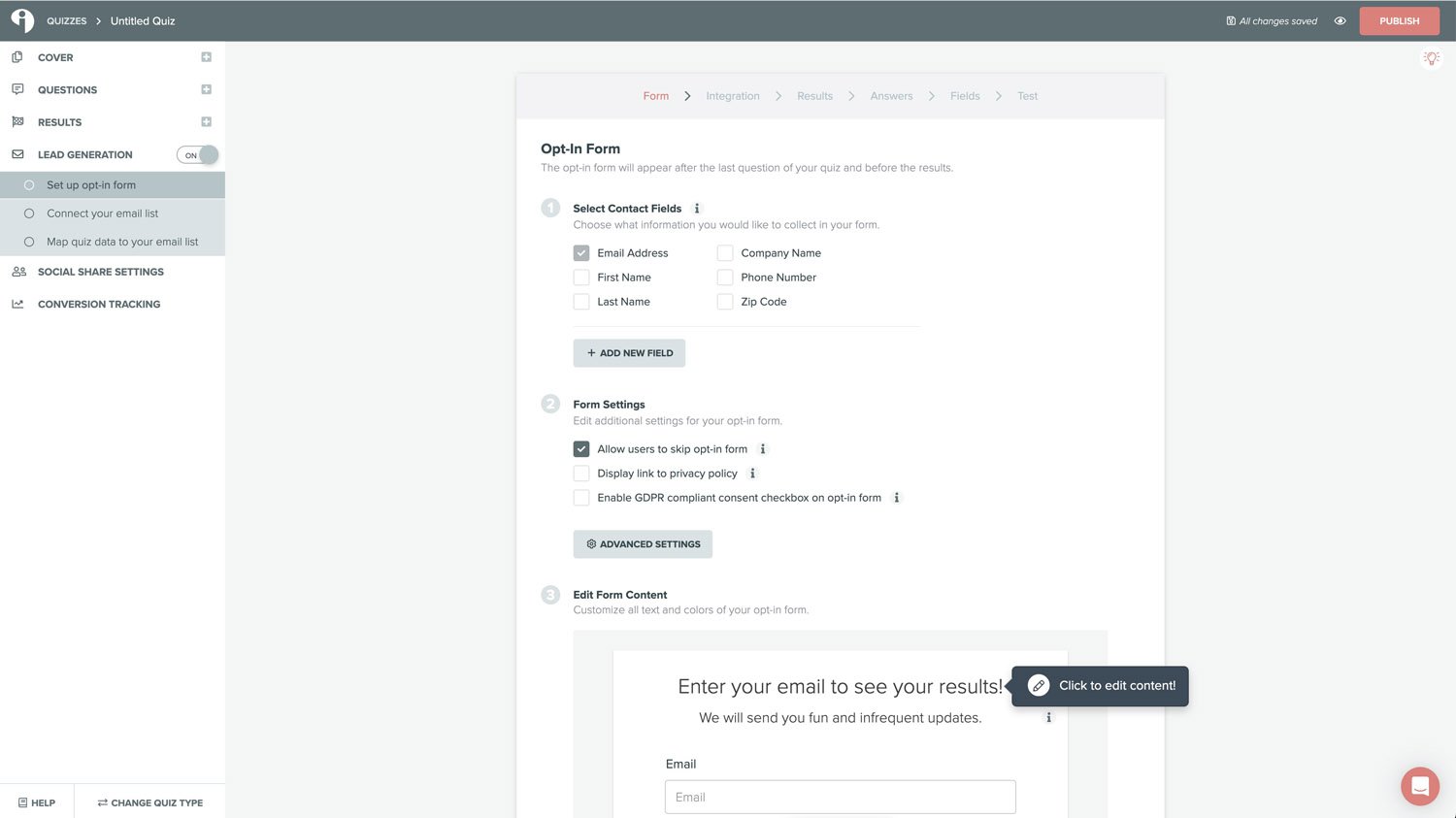 The first is to choose what information your quiz taker needs to give to get access to their results at the end (I suggest email and maybe first name, but try to keep it simple - the more fields the lower conversion is).