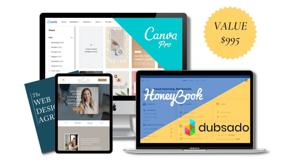 That includes a layer drafted web designer client contract between you and your clients, one year of Canva pro, and one year of your choice of a CRM system (either Dubsado or Honeybook).