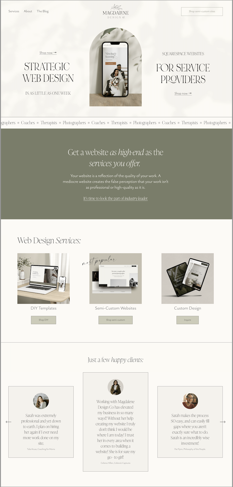 Sarah: I primarily do those semi-custom two-week websites. I've gotten to a point where that's just such a smooth process that I don't spend a lot of time on it.