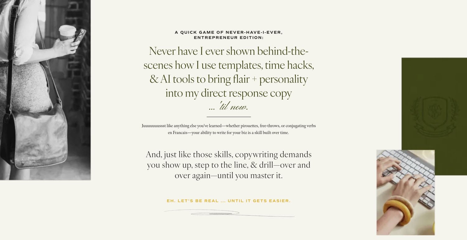 Here’s a Squarespace template from the wonderful Big Cat Creative (yup - that’s an affiliate link, the team at BCC creative some of the best Squarespace website templates out there!) that nails it beautifully. There's one main color background and then we have a few photos sprinkled throughout, not necessarily aligned or anything, a very unaligned look and it looks really fresh.