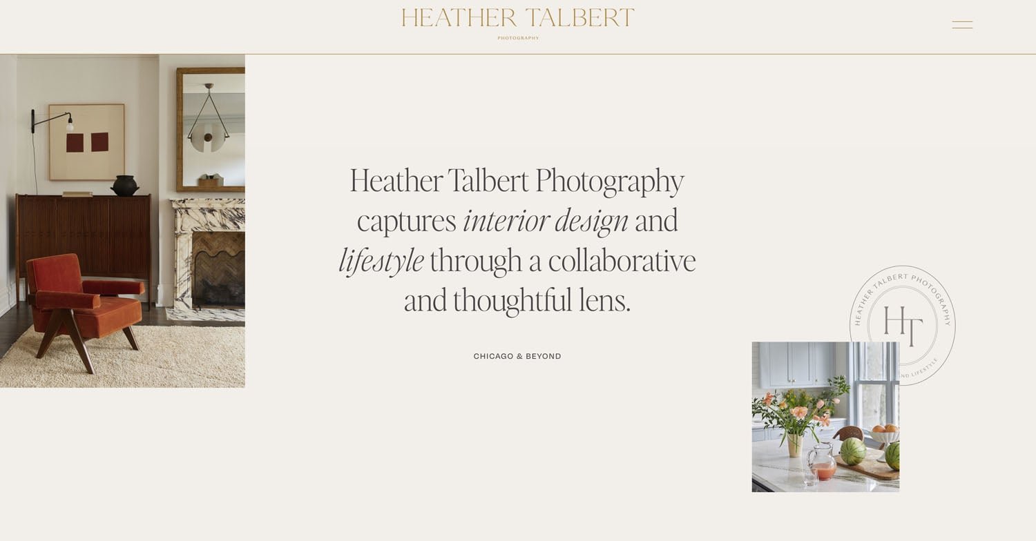 And we can spot the same thing here on Heather Talbert's website too. She has a few photos, text, and a solid color in the background - again nailing this website trend of sprinkled images.
