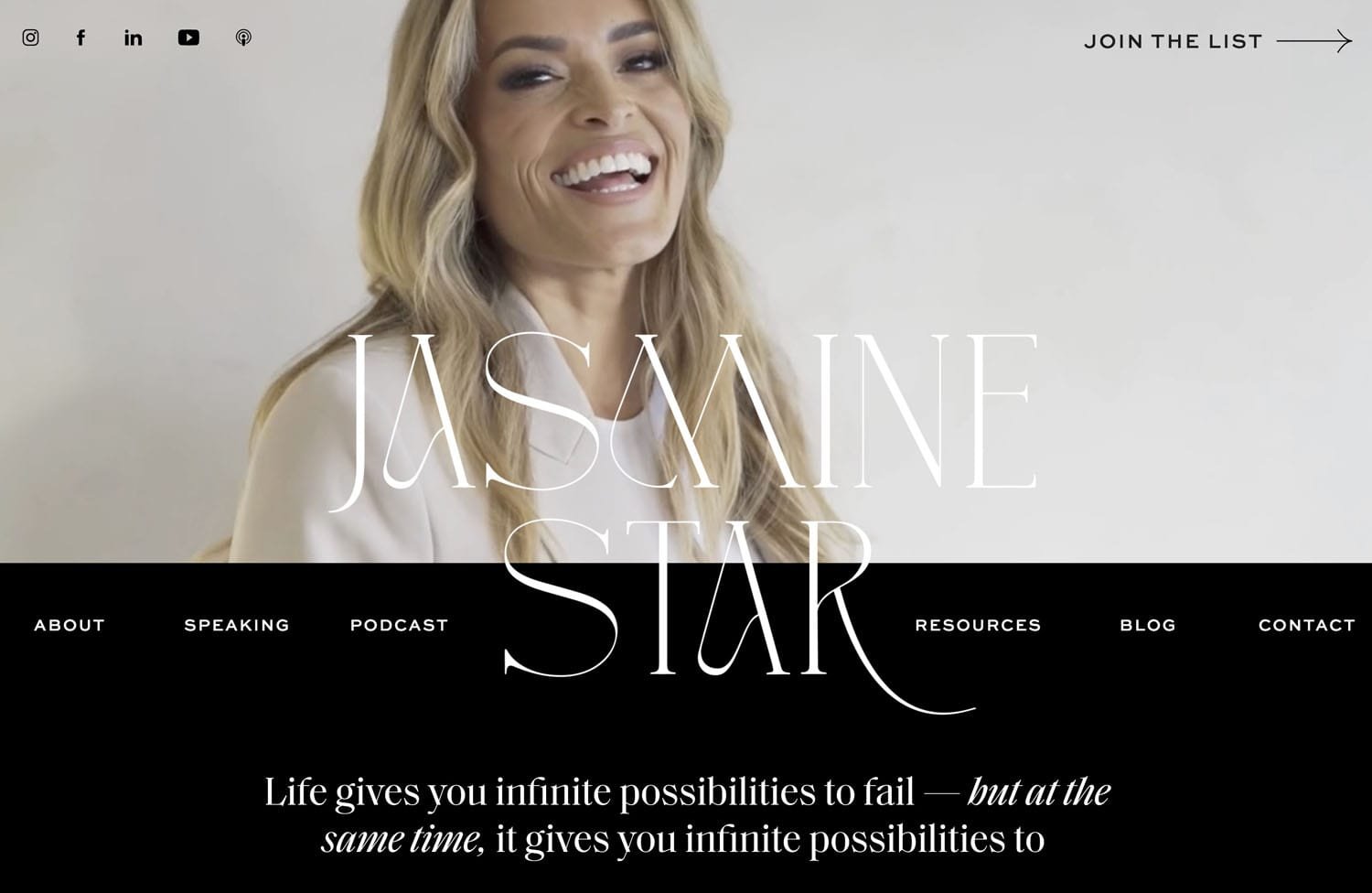 Another great example of this is if we head on to Jasmine Star’s website. Here her name is in the ginormous text which is really something that is looking very modern right now.