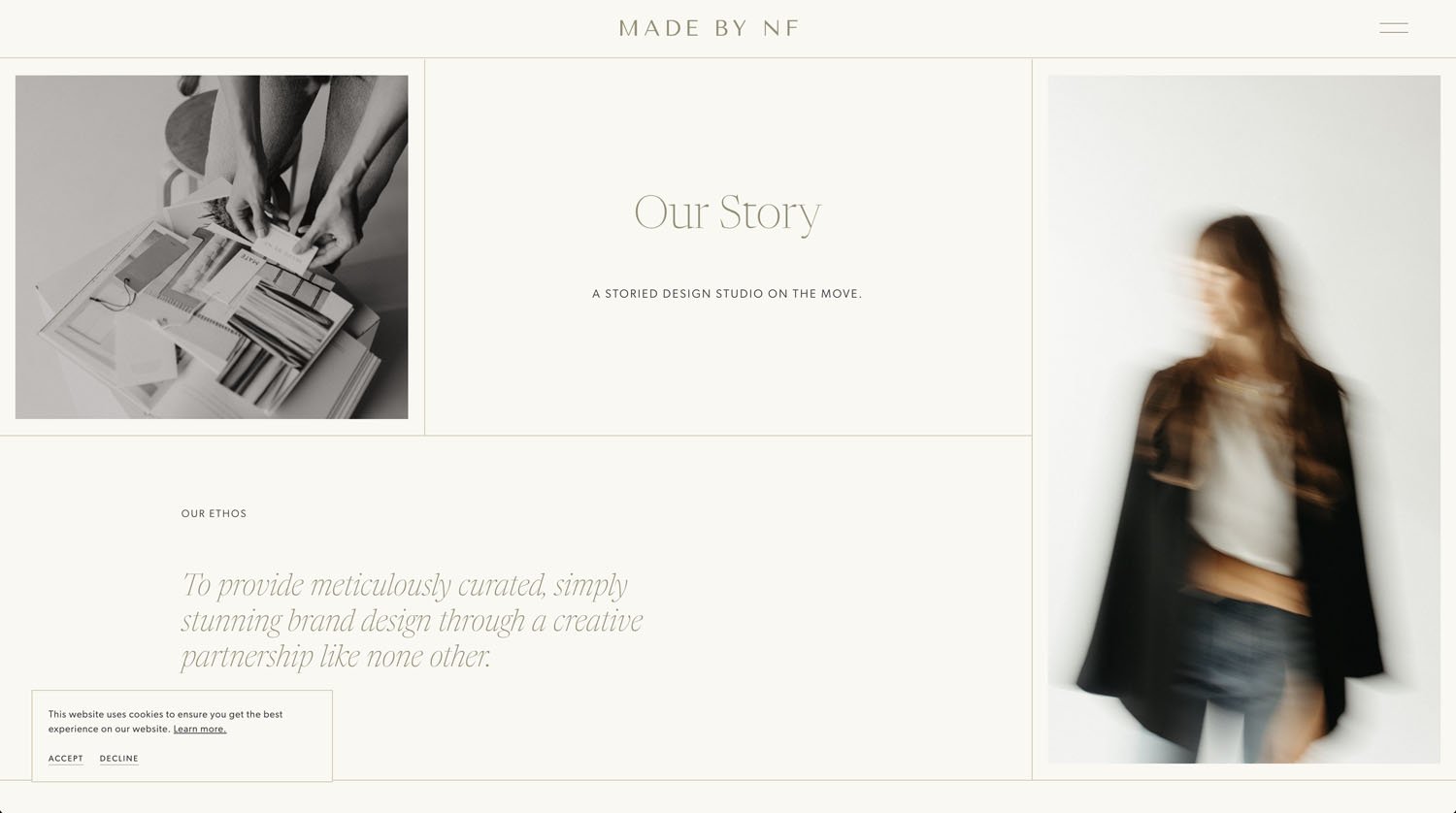 This might be a video or a gif or series of images that slowly change - nothing too crazy, but something that just adds a little more visual interest than a simply static page. I love this example from madebynf (scroll down to the “meet nikki” section to see what I’m talking about).