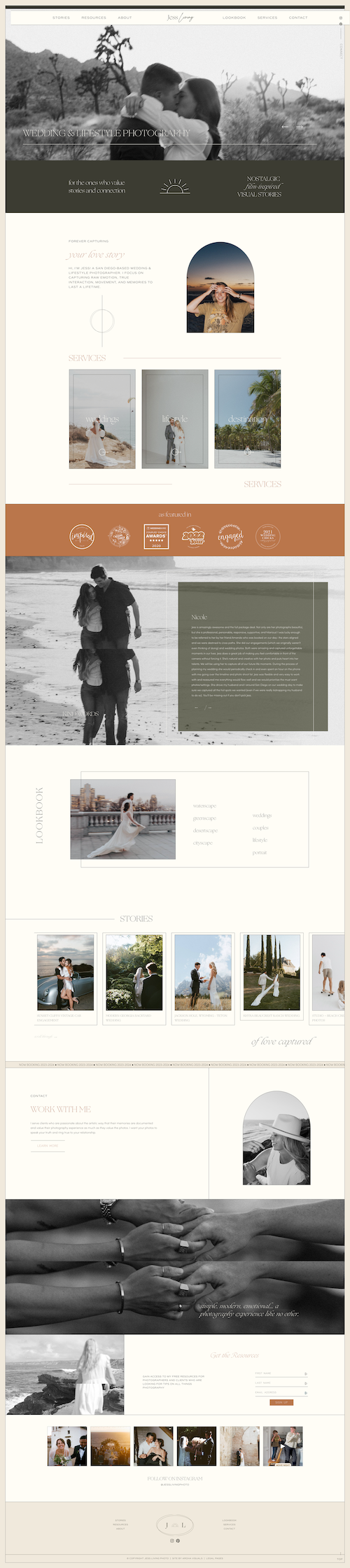We see our photographer herself, this is Jess based in San Diego. We have some icons, then we go through the different types of photography that she does, and then we also have her featured and awards section.