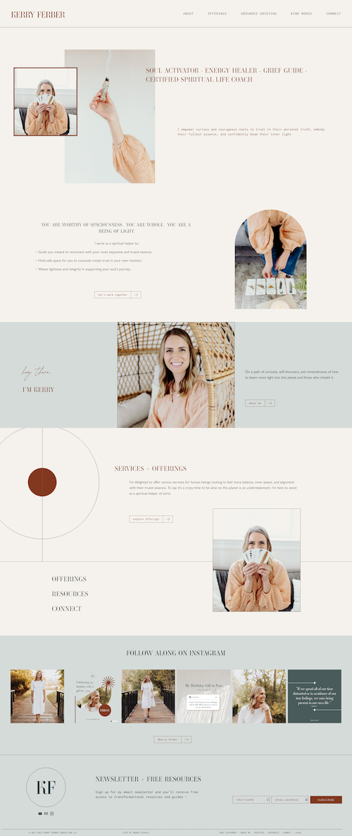 Then we have an image of Kerry and some graphic design elements further down the site. It's really wonderful, especially if your client doesn't have fantastic photos for your website (I mean, Kerry does), but this is a really great example of how you can add visual interest to a section of the page.