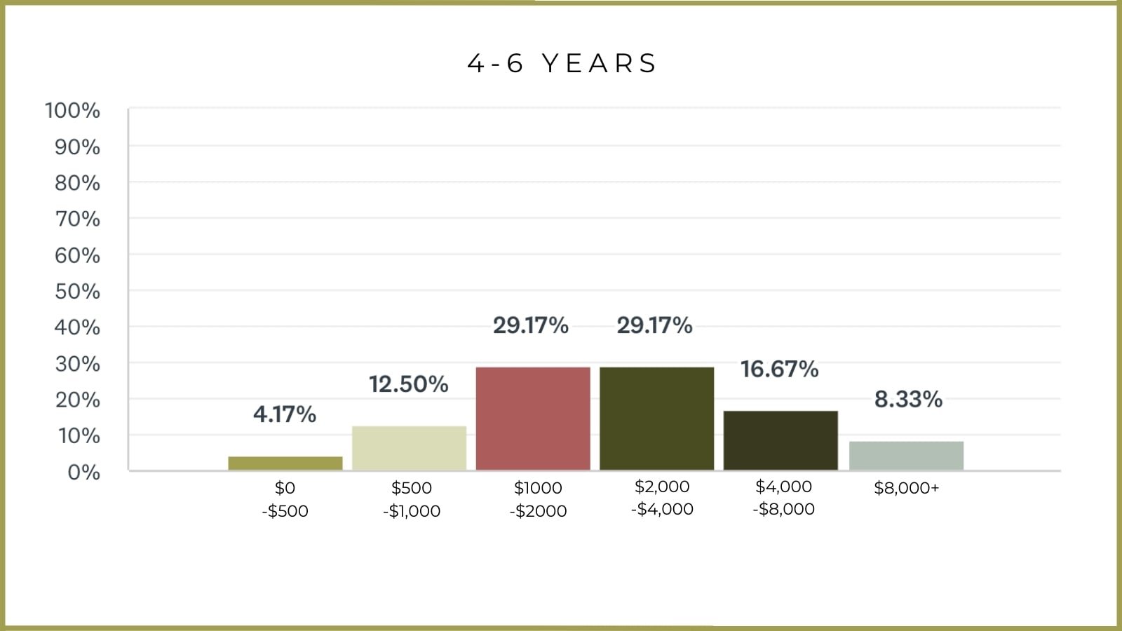 With 4–6 years of experience, designers typically settle into the $2,000–$4,000 range, with nearly 30% charging at this level.