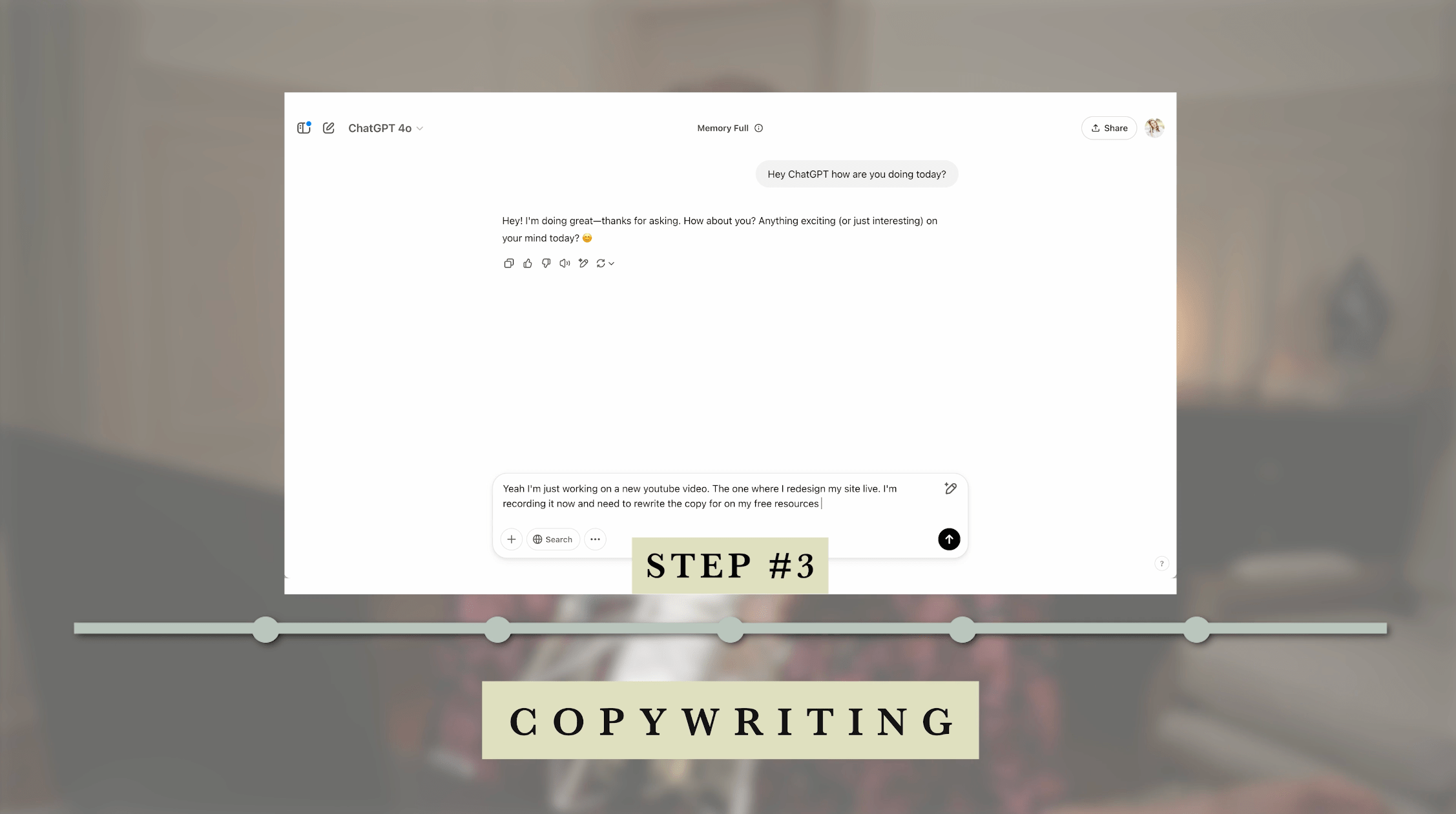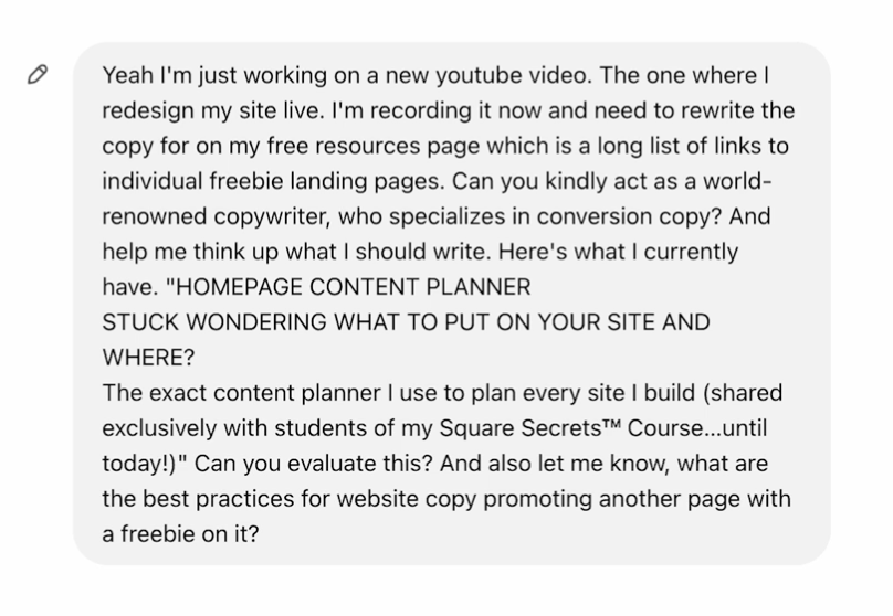 When rewriting copy, sometimes I do it from scratch, but other times I use ChatGPT to speed up the process. It’s been trained to match my brand voice, so I’ll often ask it to act as a world-renowned copywriter specializing in conversion copy and evaluate my existing text. I also make sure to ask it for best practices—for example, what’s the ideal way to promote a freebie on a website?