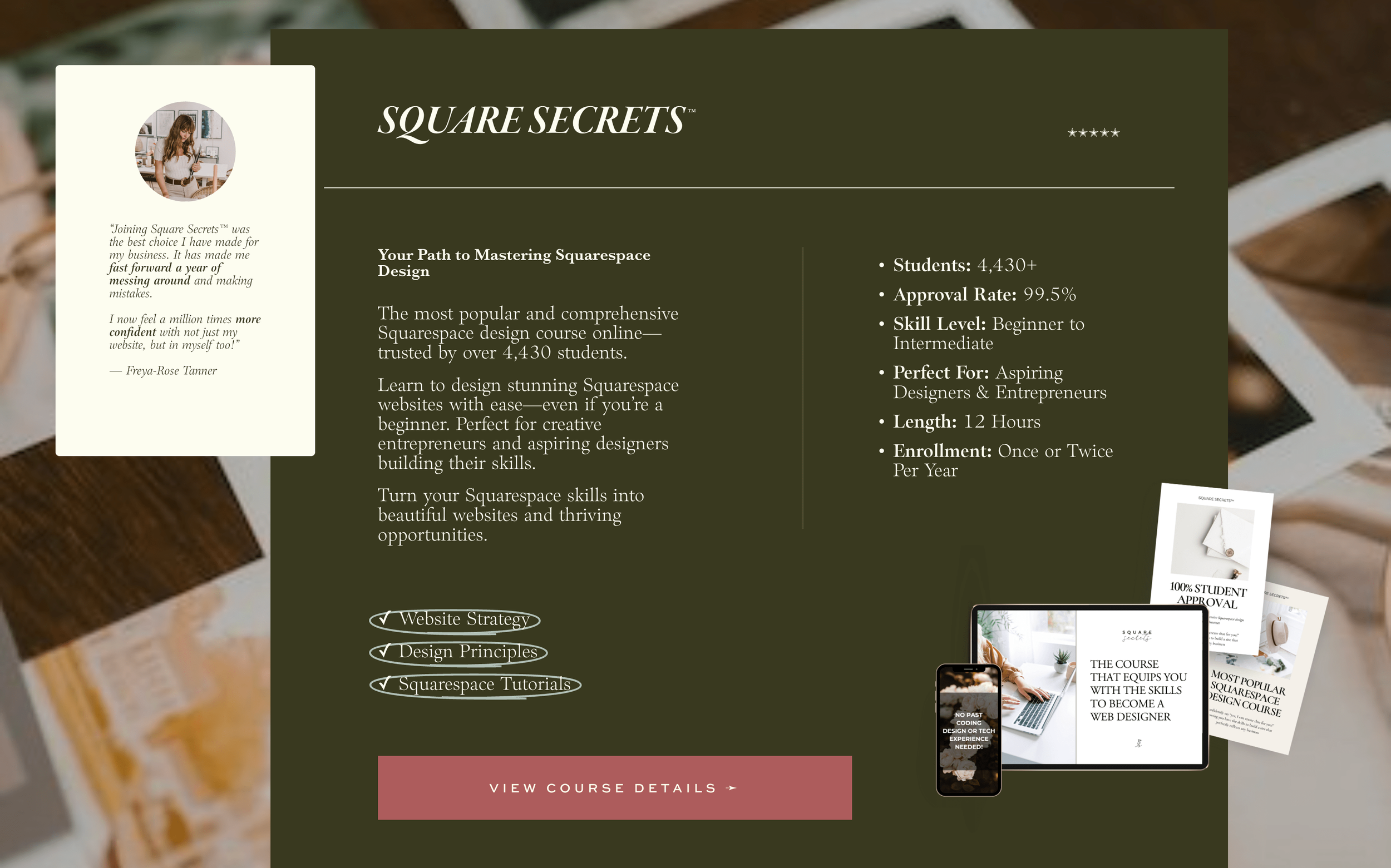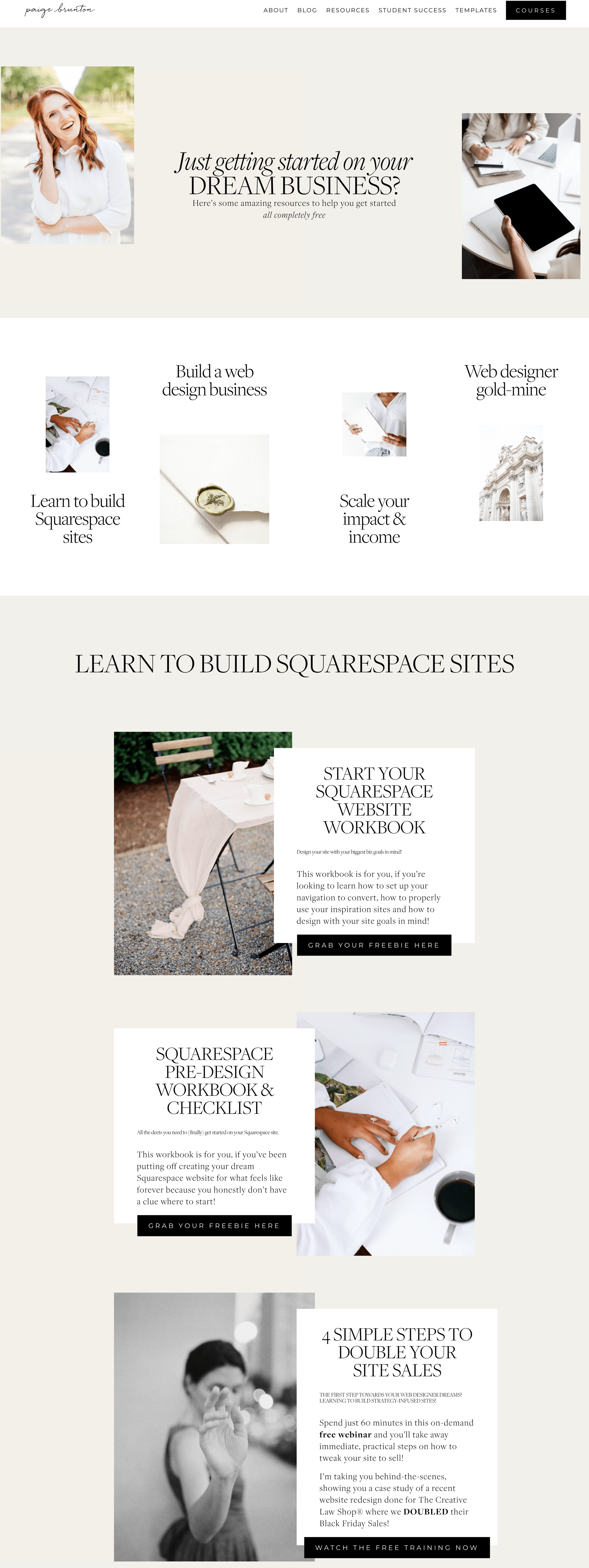 Paige Brunton is a Squarespace expert, website designer and online educator. Through her blog and Squarespace courses, Paige has helped over half a million creative entrepreneurs design and build custom Squarespace sites that attract & convert their ideal clients & customers 24/7. She also teaches aspiring designers how to take their new Squarespace skills and turn them into a successful, fully-booked out web design business that supports a life they love!